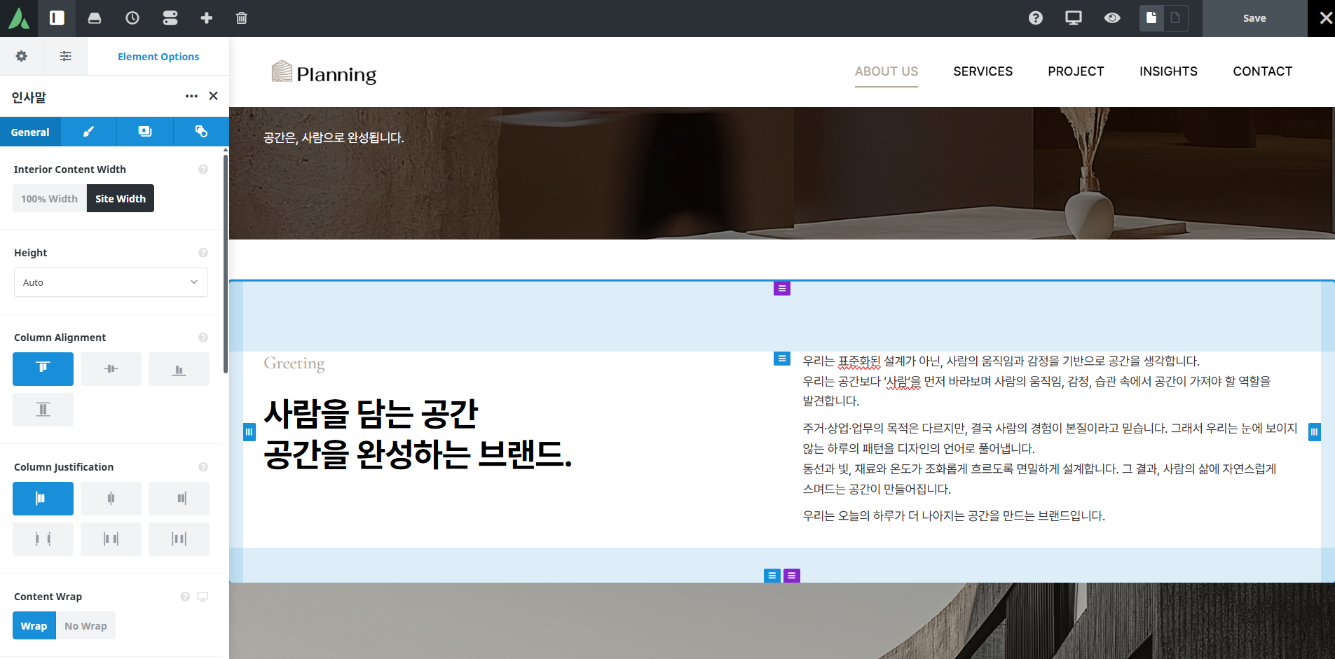 빌더의 구조는 Container(컨테이너) 안에 Column(칼럼) 안에 Elements(앨리먼트)가 들어 있는 구조로 Avada 빌더의 핵심 구성 요소로, 웹 페이지를 설계하는 기본적인 블록입니다.